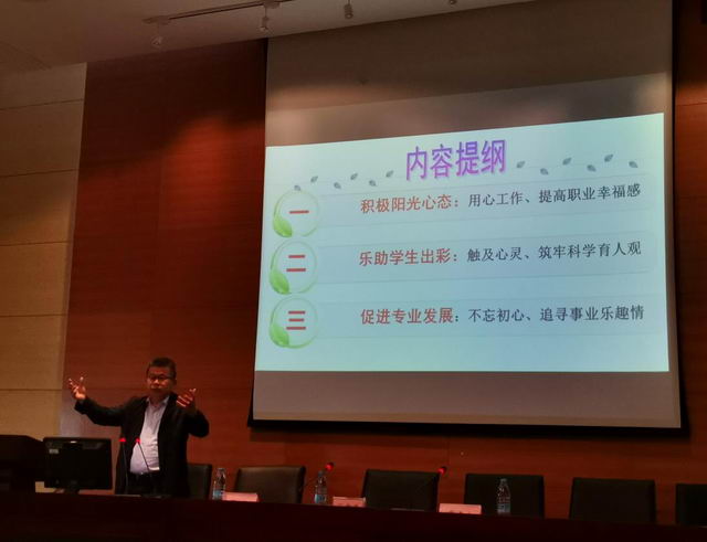 张教授从分析职业学校教师职业压力的影响因素入手,向在座老师发问:职业学校教师如何取得认可感?获得感?平等感?归属感?重点讲述了“积极阳光心态:用心工作、提高职业幸福感”、“乐助学生出彩:触及心灵、筑牢科学育人观”和“促进专业发展:不忘初心、追寻事业乐趣情”三个方面,内容丰富,针对性强。张教授饱含激情、风趣生动的讲座,给每一位职业教育工作者带来了全新的教学理念和教学思路的启迪,赢得了与会老师的热烈掌声。